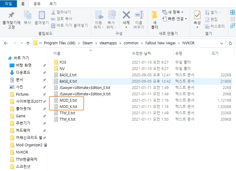| 위의 txt 파일을 압축해제하여, "NVKOR" 폴더 내부에 넣어주세요. 이 작업을 하는 이유는 Universal item sorter.esp 아이템 정렬을 할 수 있도록 해주는 것인데, 원래는 txt 추가 입력을 하셔야하지만 제작된 txt 파일을 공유하여 넣어주시면 손대실 부분이 별로 없기 때문입니다. Universal item sorter.esp 모드를 필요로하며, TTW에만 적용됩니다. |