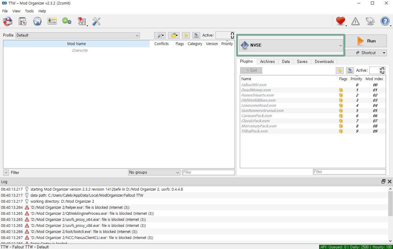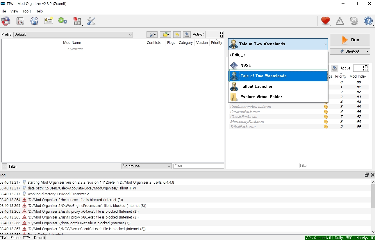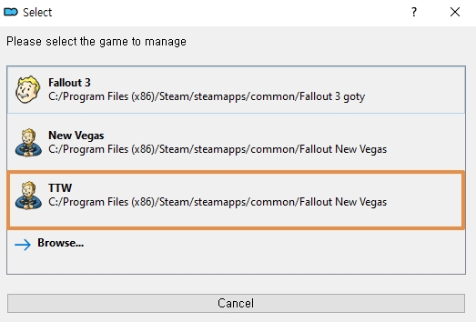 | Mod Organizer2 설치 후 TTW 를 클릭해주세요. "NVSE" 리스트에서 "tale of Two Wastelands"로 변경해주세요. |
