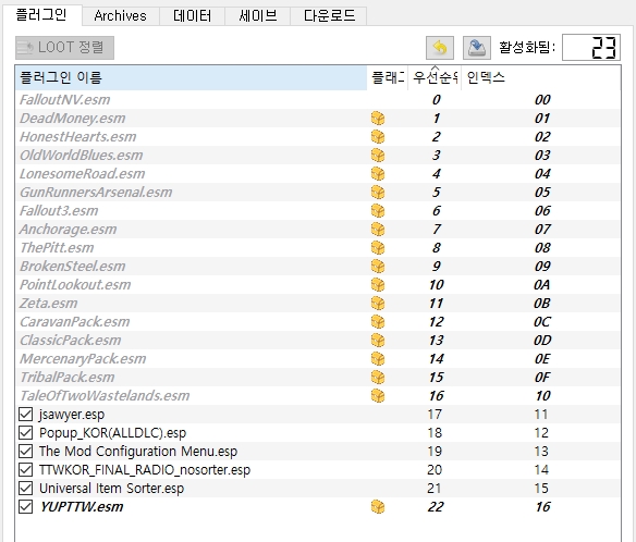 | 해당 리스트처럼 적용되신것이면 된것입니다. 굳이 배열은 상관없지만, 오거나이저2 배열에 따른 읽기가 다르기 때문에, 가급적이면, TTWKOR_FINAL_RADIO_nosorter.esp 만 제일 아래로 배열해주세요. |