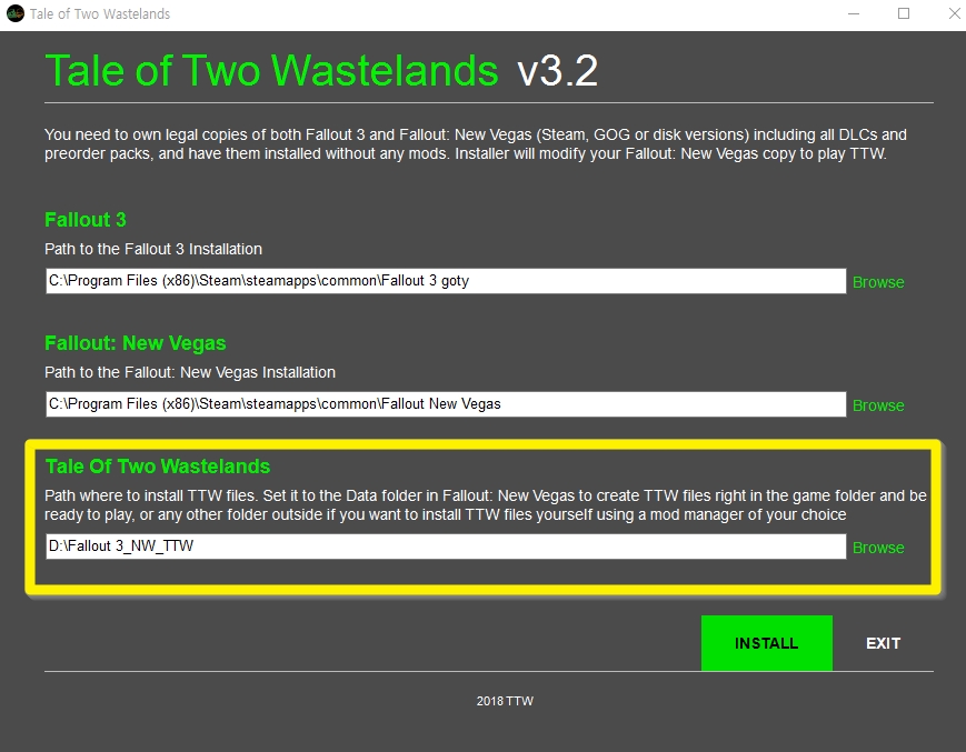 | 전제조건 : 폴아웃3 + 뉴베가스를 게임 실행을 1회씩 해주세요. Fallout3 > 설치 경로 설정 Fallout : New Vegas > 설치 경로 설정 Tale Of Two Wastelands > 두 게임을 합친 데이터를 저장하는 곳(가급적이면 새로운 경로에 저장해주세요) "Install 버튼 클릭" 생각보다 시간이 다소 걸립니다. M.2 SSD 기준 30 ~ 40분 |