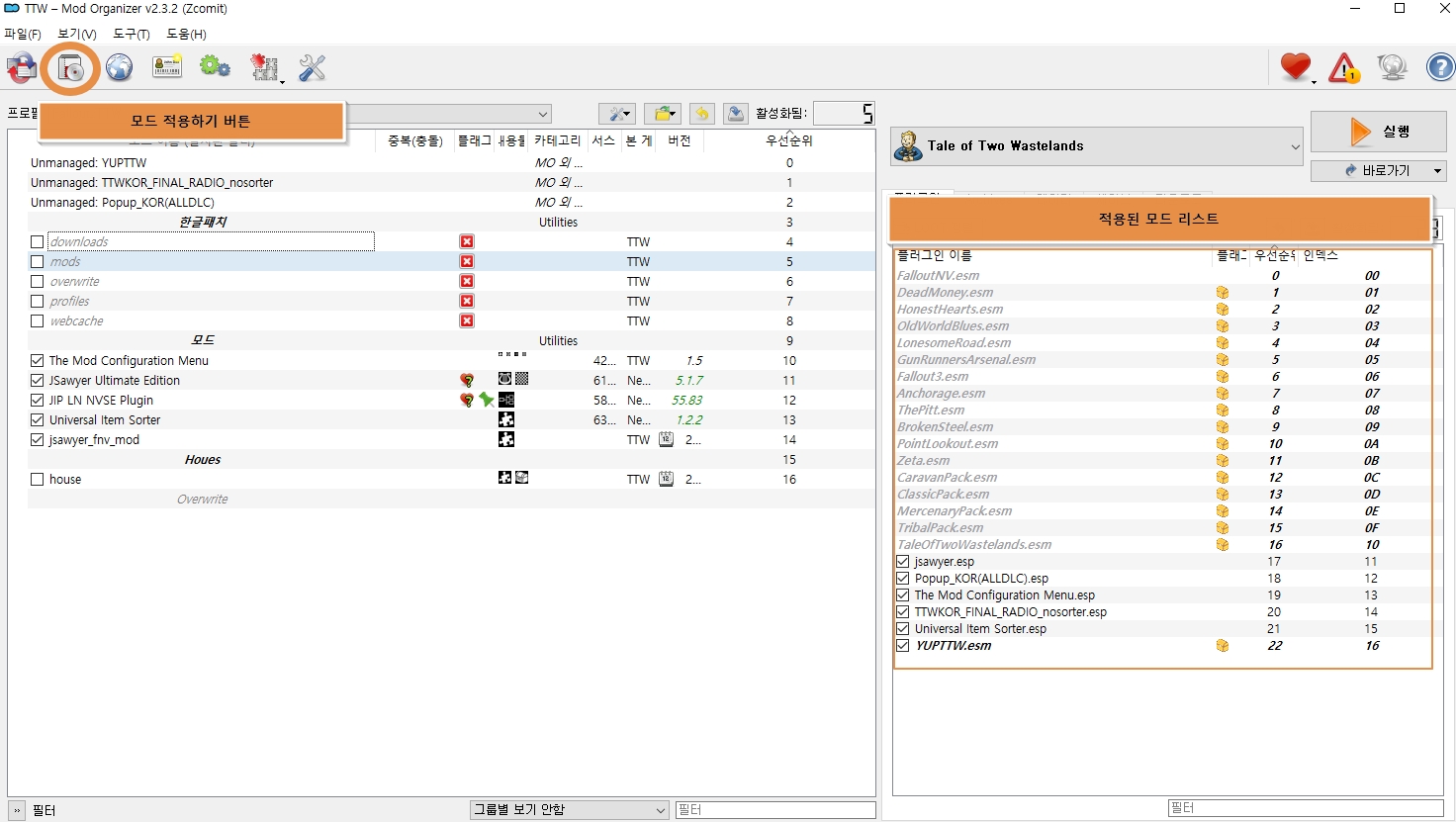 | TTW installer | Mod organizer2 | Jsawyer.esp | Popup_KOR(AllDLC).esp |