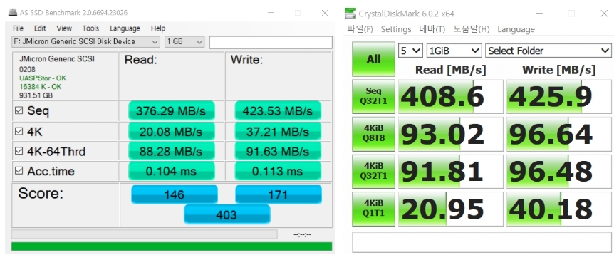 ※ 벤츠마크 프로그램 CrytalDiskMark v6.0 / AS SSD 2.0 벤치마크로 각각 2회씩 진행하였습니다. (좋은 결과값으로 작성)
