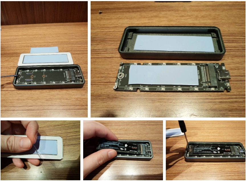 제품안에 동봉되어진 서멀패드의 코딩지를 제거해야합니다. 또한 기판 아래에도 써멀패드가 부착되어 있으니, 동봉되어진 나사를 통하여 각 사이드 4개의 나사를 풀어 써멀패드의 코팅지를 제거하여 재조립 해주시면 됩니다.