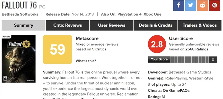 | 메타크리틱에서 유저 평점과 게임 스코어는 최악의 게임이라는 것을 보여주듯이 매우 낮은 평점을 받기 시작하였으며, 많은 비판을 받은 게임이 되었습니다. 망겜의 징조였던 출시 이후 바로 크게 세일에 들어가게되었고, 이에 따라 게이머들의 불만은 하늘을 찌르기 시작하였습니다. 비하인드 스토리로는 폴아웃76을 제작한 스튜디오가 오스틴 스튜디오에서 제작하게 되었는데, 자체 완성작이 하나도 없던 개발사였으며, 다만 폴아웃이 멀티로 돌아갈 수 있도록 프로토타입을 개발했다는 이유로 프로젝을 맡게된 것이 문제였으며, 두번째로는 오스틴 스튜디오 자체가 대규모 구조조정을 받은 이후에 제작된 게임이 폴아웃76이었기 때문에 더욱 문제가 많았다고 합니다. |