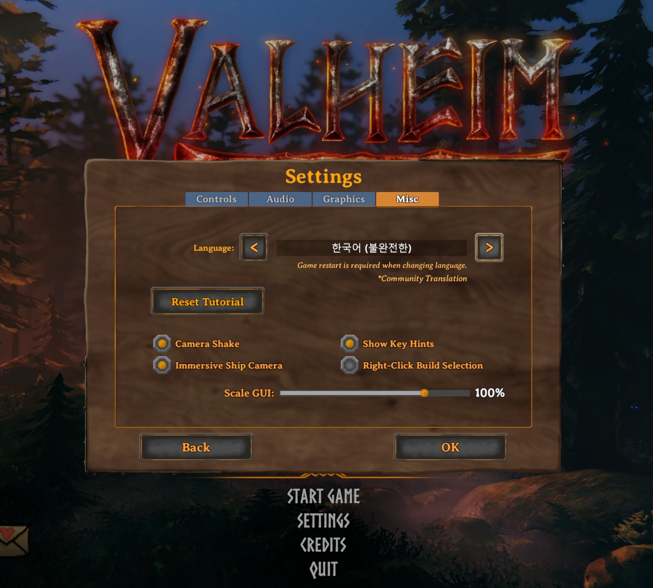 | 1. 게임 화면에서 "Settings" 클릭 2. Misc 탭에서 Language > 한국어로 변경 3. 게임 종료 후 재접속 |