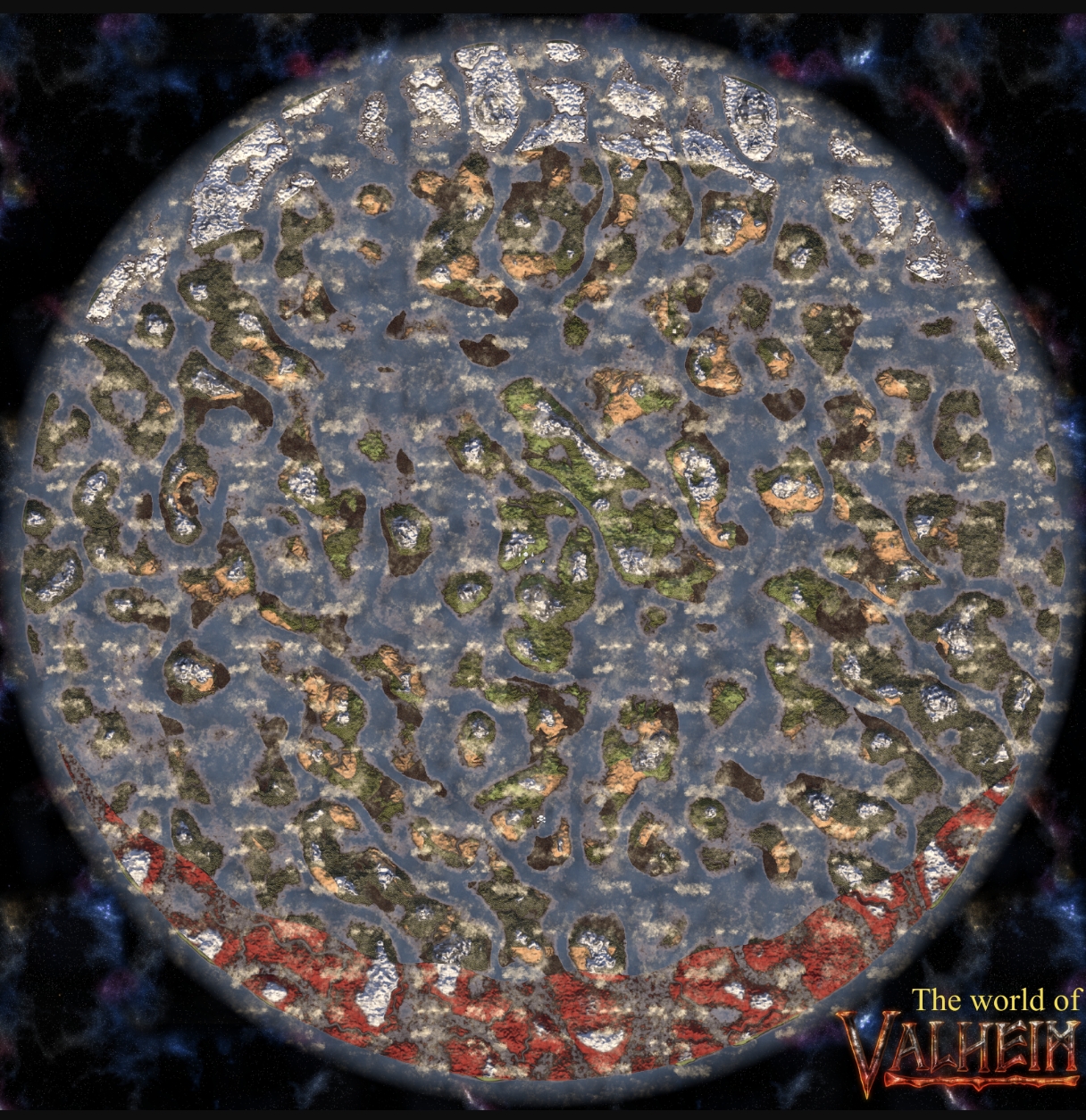 | 발헤임에서 보여주는 제 10세계는 굉장히 넓은 맵으로 되어 있으며, 북쪽에는 북극, 남쪽에는 밀림으로 구성되어 있으며, 각 맵에 따른 몬스터들도 다양하게 출현합니다. 따라서 발헤임을 즐기실때 탐험을 목표로 두신다면 매우 좋은 게임이 되실 수 있을 것 입니다. 참고로 중앙맵 1개 전부 밝히는데 2시간 정도 걸립니다. |