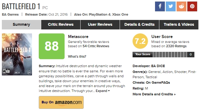 | 개인적으로 EA 플랫폼을 싫어하지만, EA 게임 중 유일하게 즐기는 게임 중 하나 입니다. 배틀필드는 FPS 게임 중 가장 대표하는 게임이라고 부르는 만큼 매우 잘만든 게임이며, 배틀필드1 같은 경우 이 시리즈 중에서도 명작에 속하는 게임입니다. 현재 세일할 경우 가격대가 매우 좋은편이니 꼭 구매하셔서 플레이를 해보시기 바랍니다. |