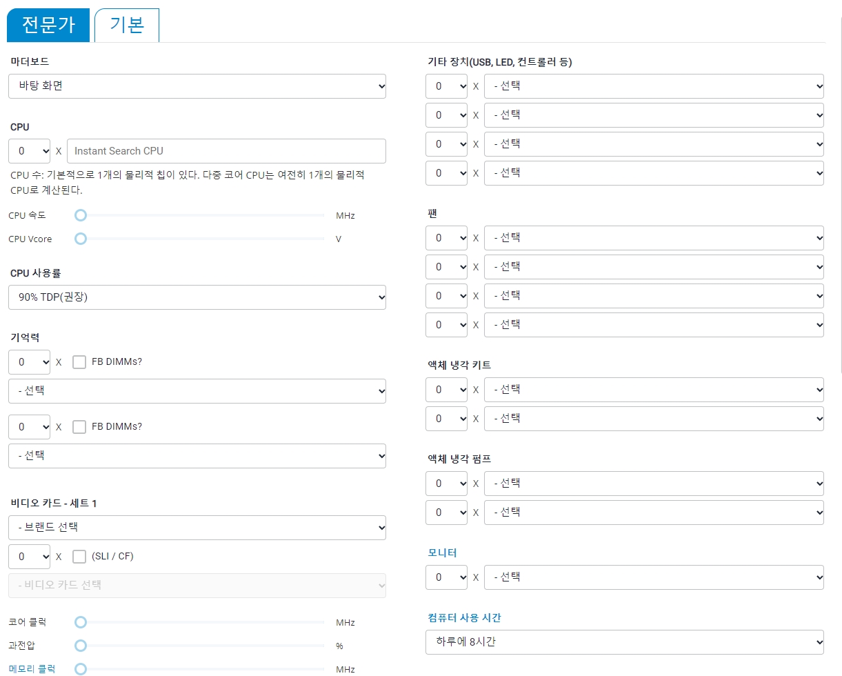 | 위 링크에 접속하여 "전문가", "기본" 항목이 있으며, 전문가에서는 디테일한 전력량을 계산하실 수 있으며, 기본에서는 대략적인 전력량을 확인하실 수 있습니다. |