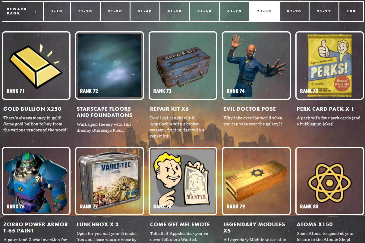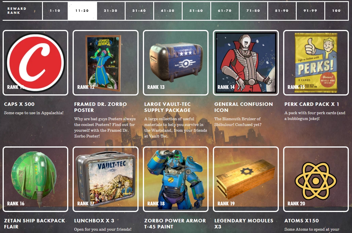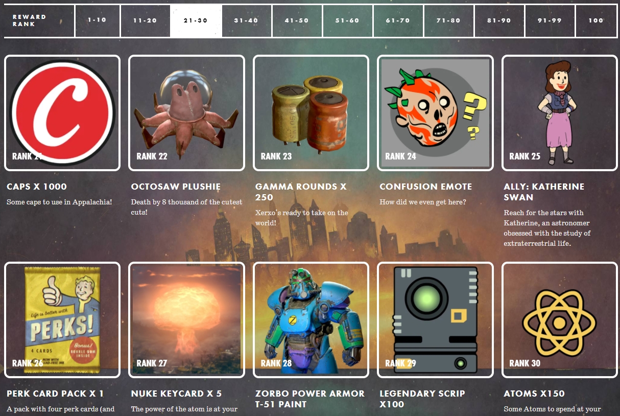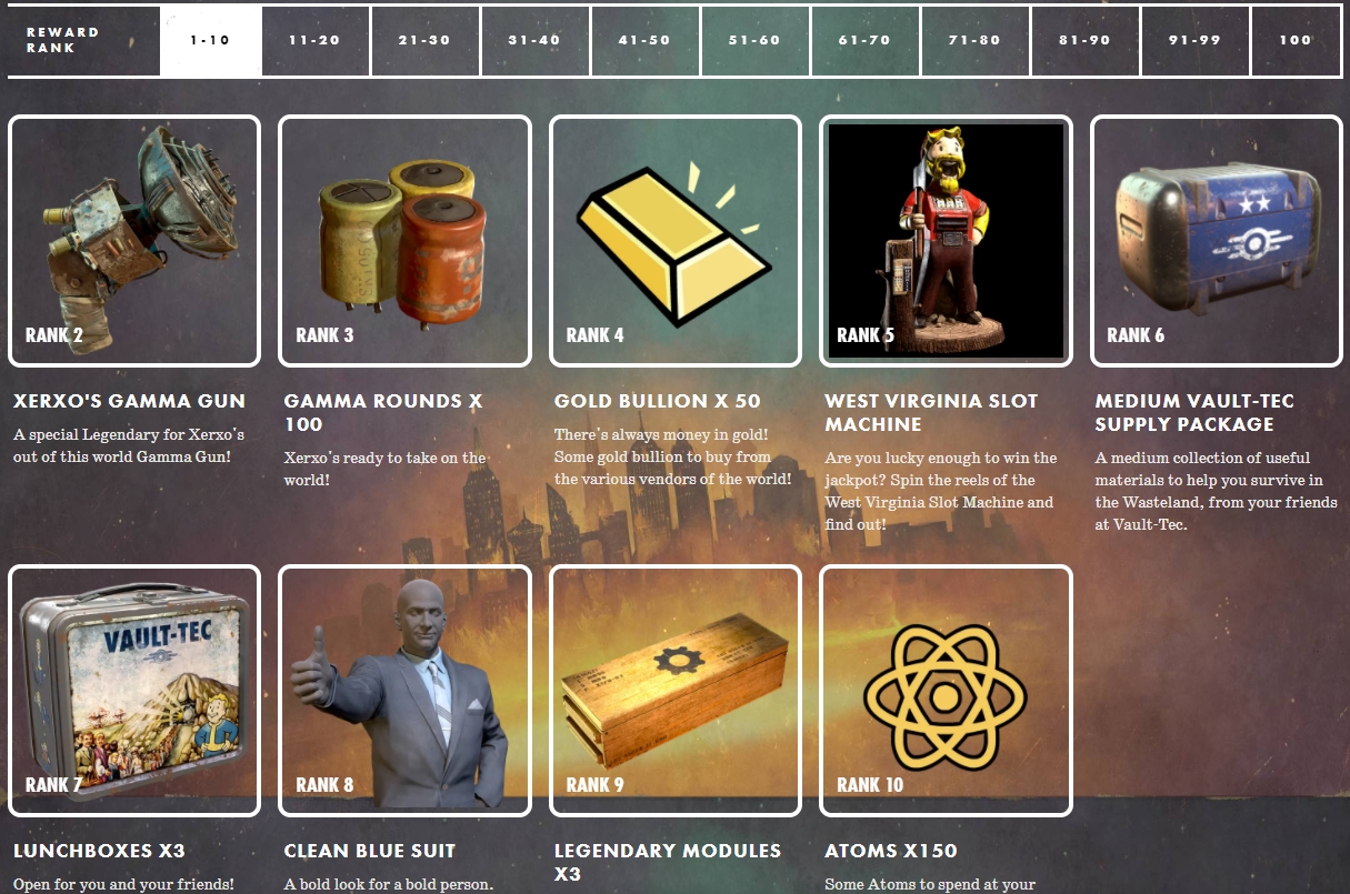 폴아웃76 스코어보드 시즌7이 2021년 12월 8일 새롭게 시작됩니다. 이번 스코어보드도 1 ~ 100까지 스코어를 획득하여 얻는 방법이며, 보상 리스트는 전체적으로 조금 아쉬운 모습을 보여줍니다.