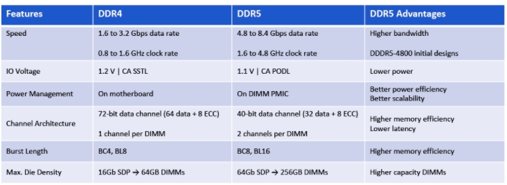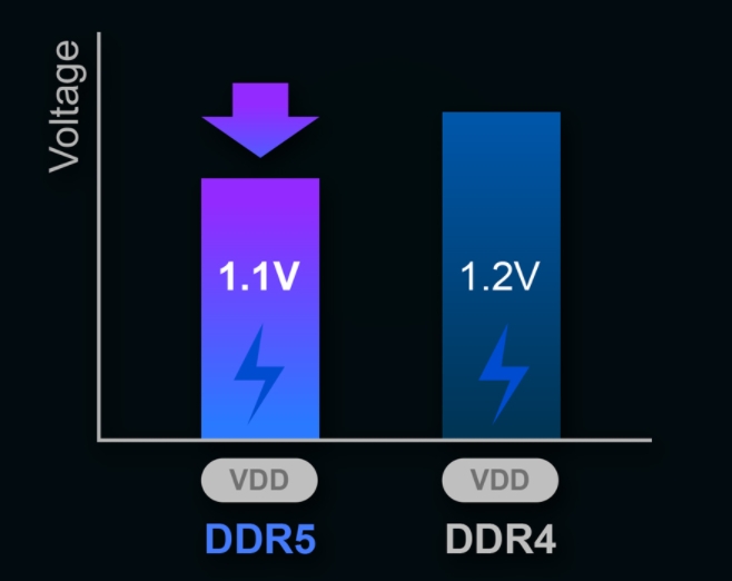| DDR5 아키텍처의 변화점은 DIMM 전력 관리가 마더보드 DIMM 자체로 이동하게 된다. 이 역할은 DDR5에 추가된 컨트롤러가 작업을 수행하며 이전보다 낮은 전력으로 신호 무결성과 노이즈를 개선하게 될 수 있었다. 또한 이전보다 높은 Bit로 인하여 출력 클럭이 높아졌다 즉 이전보다 낮은 전력으로 데이터 및 정보에 보다 빠르게 액서스 할 수 있게 되었다고 생각하면 된다. |