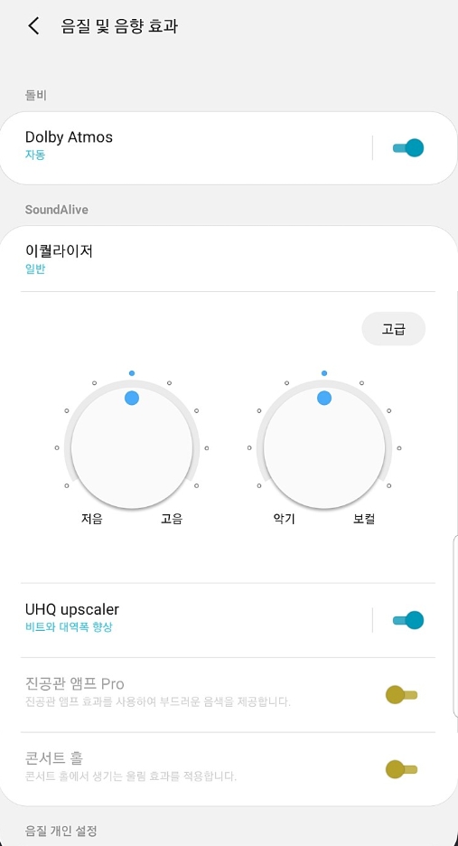 | 설정 > 소리 및 진동 > 소리 고급 설정 > 음질 및 음향효과 > UHQ upscaler 적용 |
