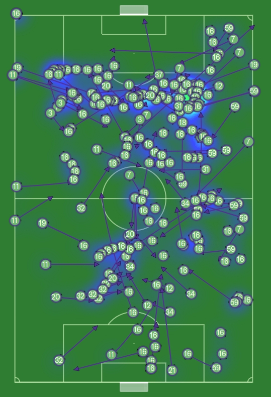 | 첫 시즌 영입 당시 나이가 18세이기때문에 조금 더 올라가며, 이적 후 1군 주전으로 사용하셔도 큰 문제가 없습니다. 대기만성형으로 올라가며, 피치컬 + 공격 + 수비 능력 모두 완벽합니다. 패스에 대한 히트맵이며, 이미지를 보시다 싶이 맵 전체적으로 고르게 활동하는 것을 확인하실 수 있습니다. 정말 구단애 자금이 충분하시다면 한번쯤 사용해보시면 매우 만족할 선수입니다. |