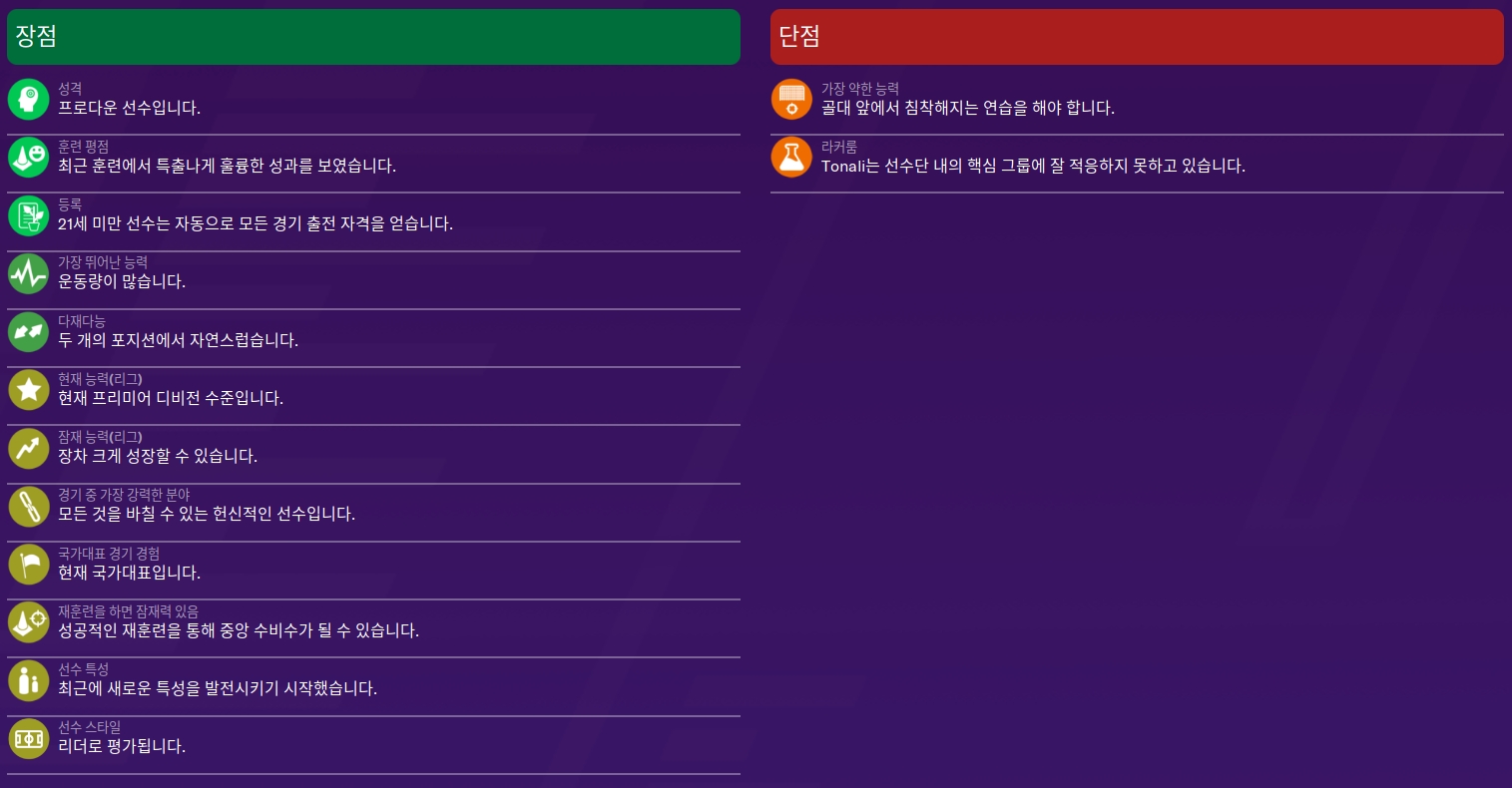 | 수비형 미드필더이며, 선호 포지션은 후방 플레이 메이커 입니다. FM2020에서는 본좌로 구분되는 유망주이기도하며, 뛰어난 공격과 수비 능력을 보여 줍니다. 특히 공격적인 플레이에서 뿌려주는 패스도 매우 뛰어나며, 중거리가 매우 뛰어나 세트피스 이후 세컨볼에 대한 중거리 슛으로 생각보다 많은 득점을 해줍니다. 단점으로는 이적료가 생각보다 높다는 점인데, 팀에 자금이 충분하다면 수비형 미드필더에서 이 선수 하나면 정말 크게 만족하실 것이라 생각 합니다. |