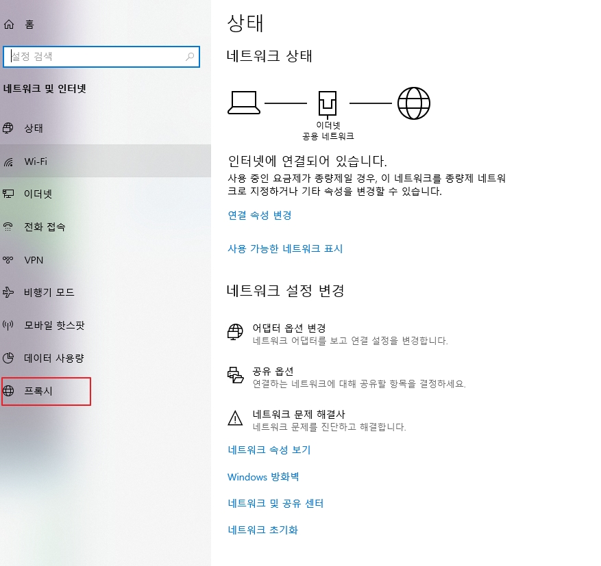 | 프록시에서 "자동으로 설정 검색" 끔으로 변경해주세요 |