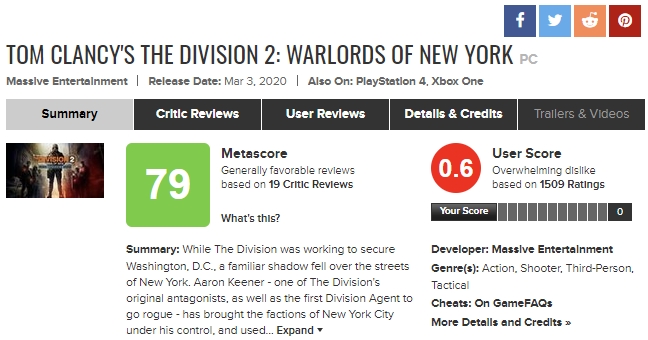 | 게임 자체의 평점은 79점이지만 게이머의 평점은 0.6점으로 매우 형편없습니다. 이는 디비전2 뉴욕이 출시하였을때, 여러가지 이슈가 되었던 문제로 인하여 평점 테러를 당한것이니 이점은 확인해주시기 바랍니다. |